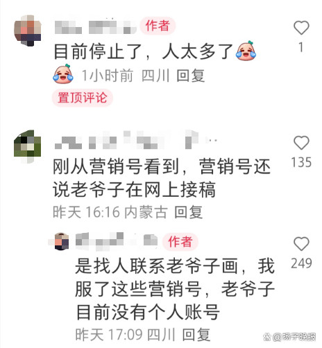 面对汹涌而来的约稿请求,博主回应称自己是托人联系的吴云初老爷子,但目前约稿人数过多,已经暂停接单,并表示“老爷子目前没有个人账号”,提醒网友不要轻信营销号。